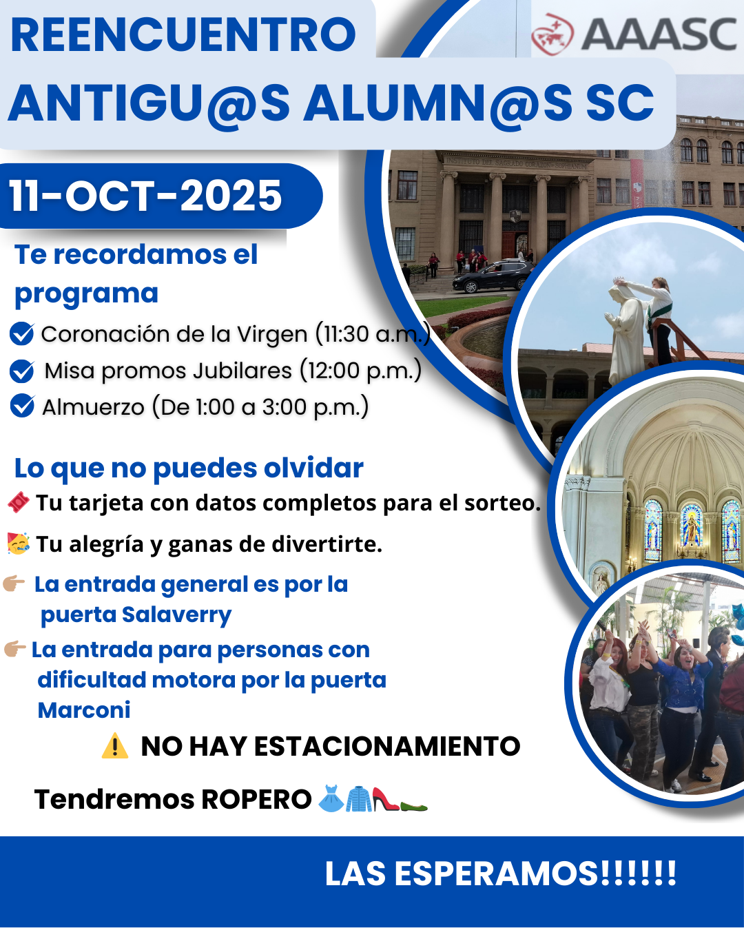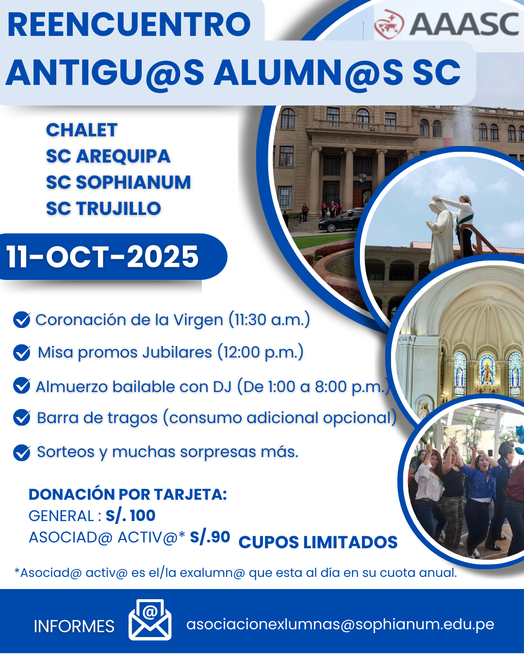 Coincidiendo con la conmemoración del mes de nuestra Mater Admirabilis, en octubre se organiza el reencuentro anual en las instalaciones del Colegio Sophianum. De esta forma acercamos a las promociones en un momento festivo y celebrabámos con ellas a las que cumplen aniversarios jubilares. Iniciamos con la Coronación a la Virgen, seguido de la Santa Misa y culminando con el almuerzo. Esperamos contar contigo y con tu promoción.